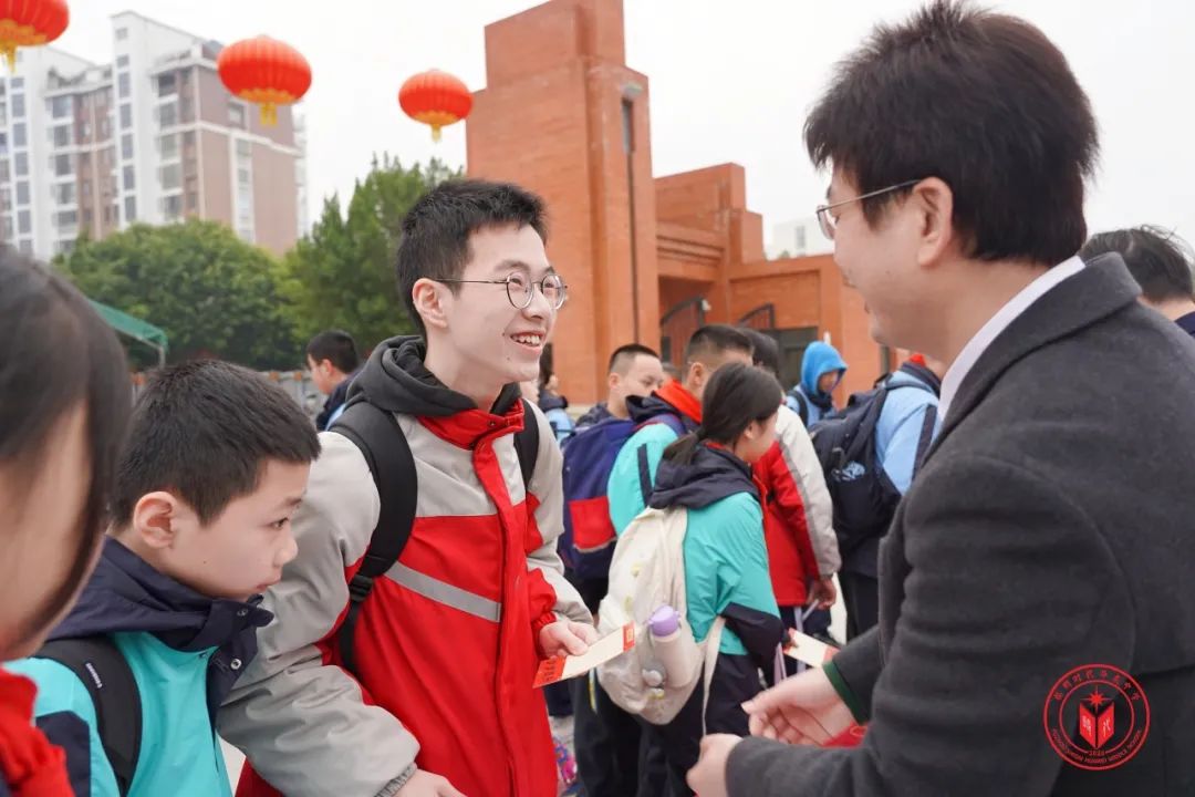 福蛇送春,新程开启。校领导们手持寓意着 “福蛇纳吉,前途熠熠” 的文创小礼品欢迎同学们回家,一声声 “新年好”,承载着对新学期的美好期许与祝福。